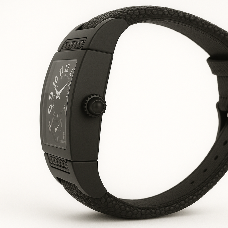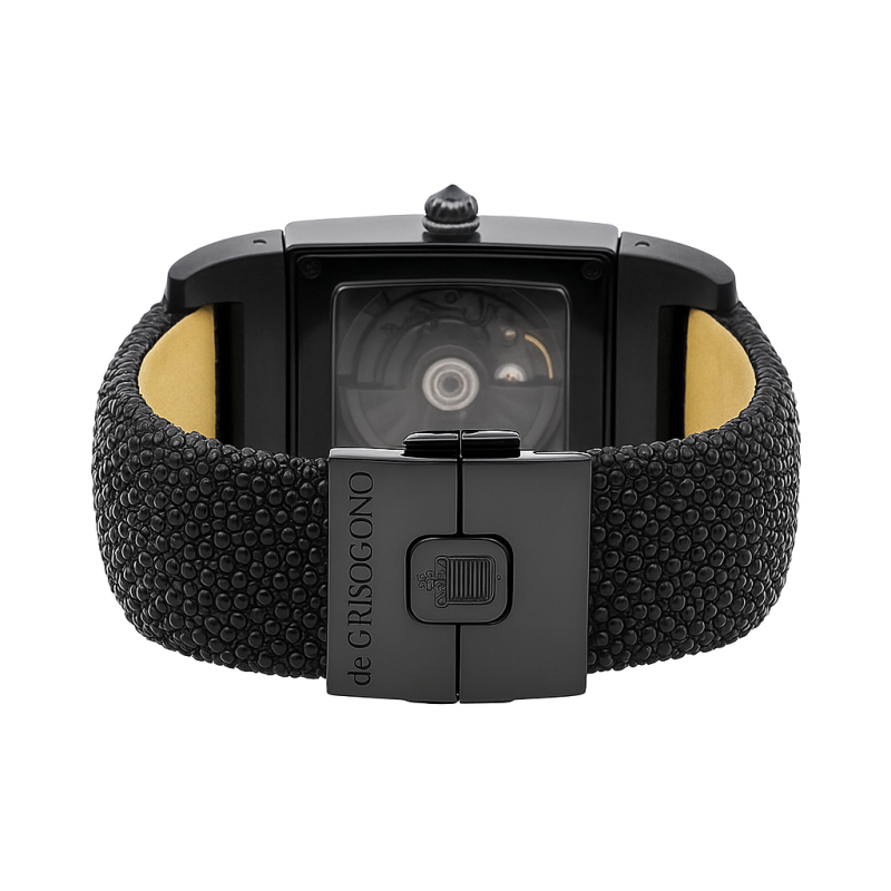 acier pvd, fond à vis transparent, réhaussé de diamants noirs, couronne de remontage réhaussé d'un diamant noir facetté