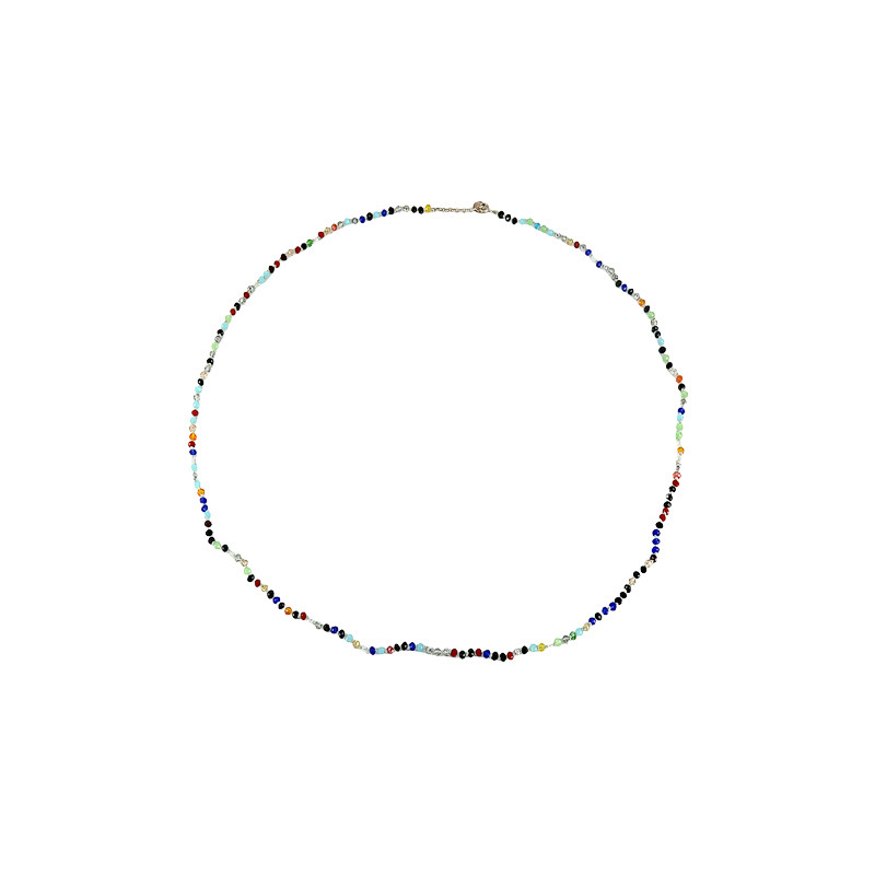 Sautoir fantaisie signé Enomis Paris composé de perles facettées multicolores. Ce bijou évoque l’esthétique bohème et ethnique très en vogue dans la bijouterie parisienne entre 1980 et 1990.