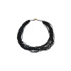 Collier fantaisie multi-rangs composé de fines perles de rocaille noires, offrant un tombé fluide et élégant. Fermoir en bois apportant une touche naturelle et authentique. Une pièce au style bohème chic, idéale pour sublimer une tenue avec caractère et légèreté.