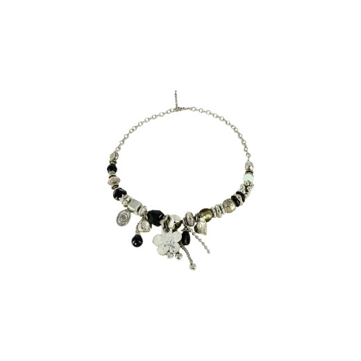 Collier sautoir fantaisie en métal argenté agrémenté de pampilles variées. Il associe des éléments en résine noire et translucide à plusieurs breloques décoratives, dont un petit cœur gravé de l’inscription « for ever ». L’ensemble crée un bijou mobile et ludique, où le mélange des matières et des pendentifs apporte du rythme et une touche sentimentale au design.
