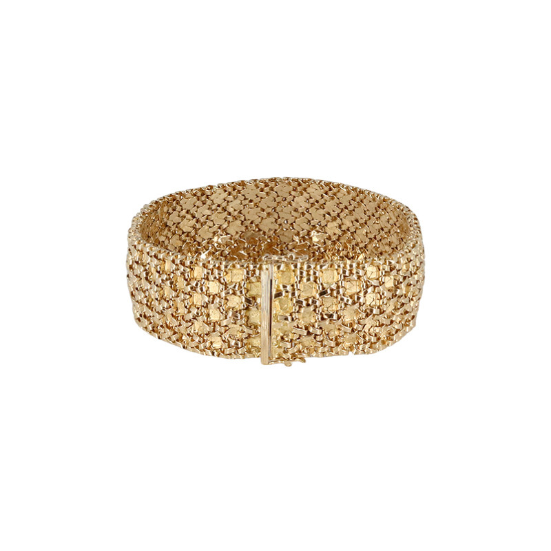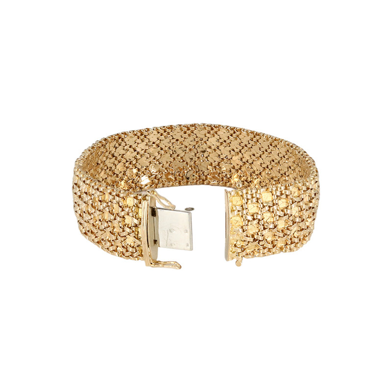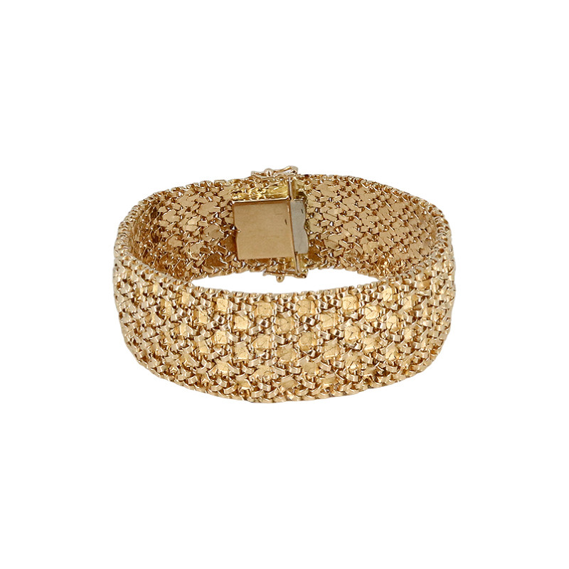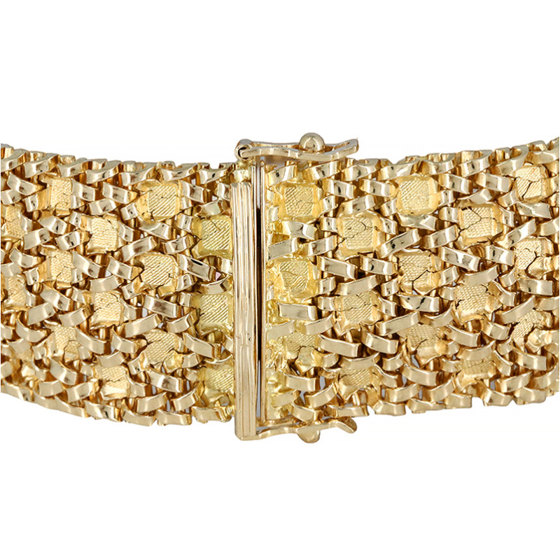 Manchette vintage en or jaune 18 carats, au superbe travail de maille tissée rappelant un véritable textile d’or.