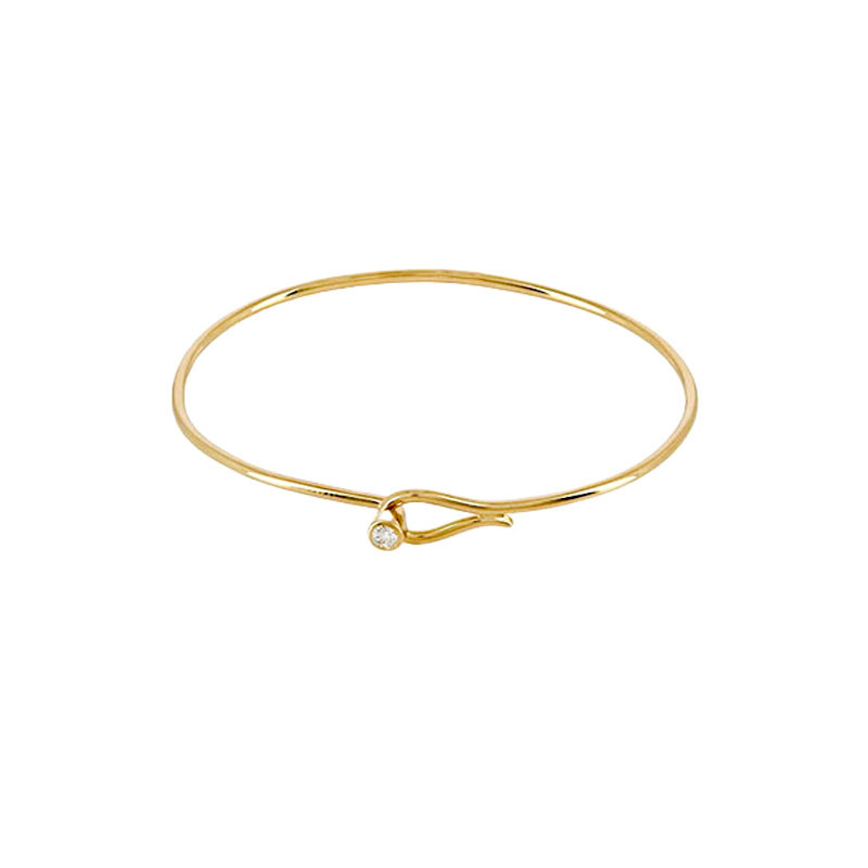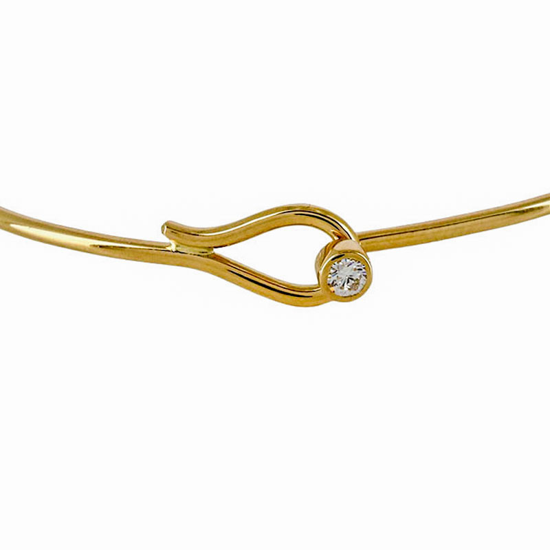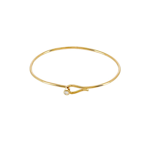 Élégant et délicatement contemporain, ce jonc flexible en or 18 carats se distingue par son design épuré et féminin. Sa ligne fine est sublimée par un motif délicat qui se referme autour d’un diamant central, apportant une touche de lumière subtile au poignet.