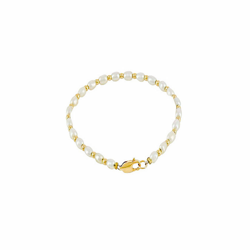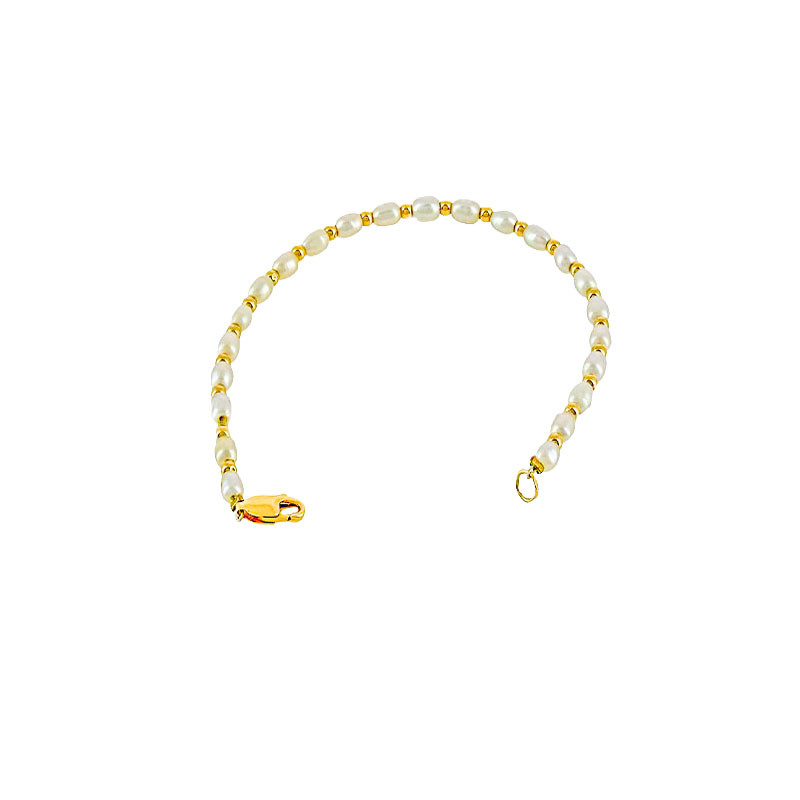 Délicat bracelet composé de perles d'eau douce naturelles sublimées par de fines perles en or 18 carats. Monté sur câble pour plus de souplesse et de solidité, ce bijou élégant et lumineux habille le poignet avec finesse et raffinement. L’association de la douceur nacrée des perles et de l’éclat chaleureux de l’or crée un bracelet intemporel, facile à porter au quotidien comme lors d’occasions plus habillées.