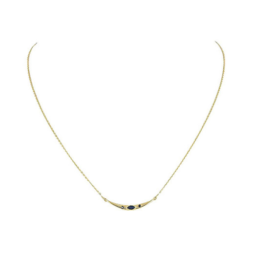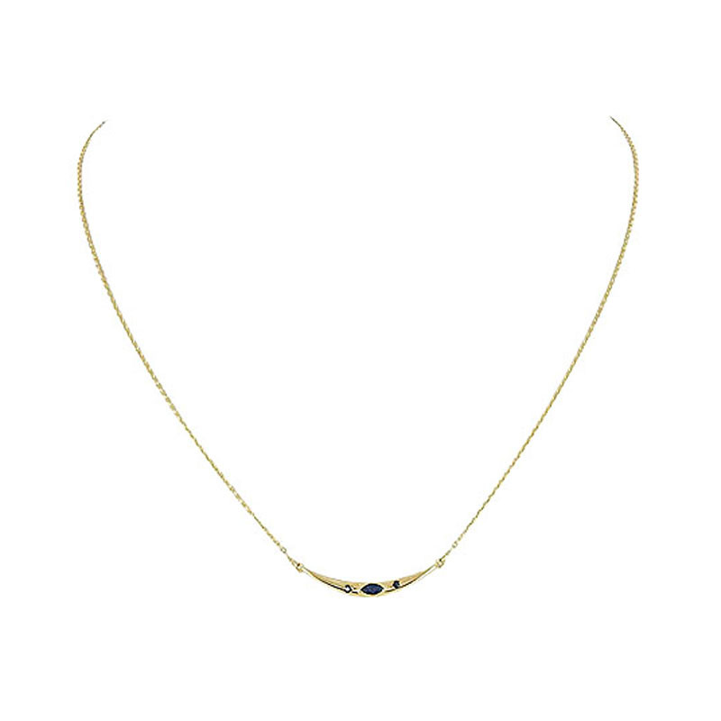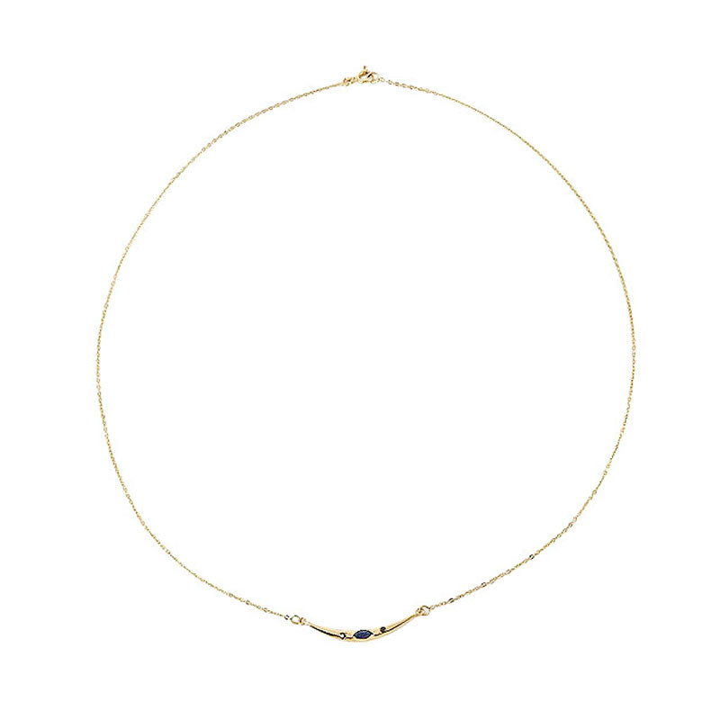 Son motif subtilement courbé, orné de saphirs profonds, capte la lumière avec finesse et souligne le décolleté avec discrétion.