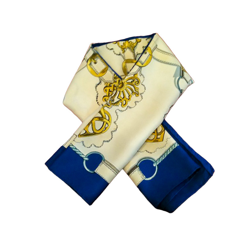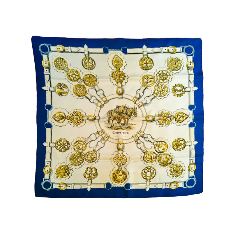 Carré Hermès Cuivreries bords bleu marine en soie.