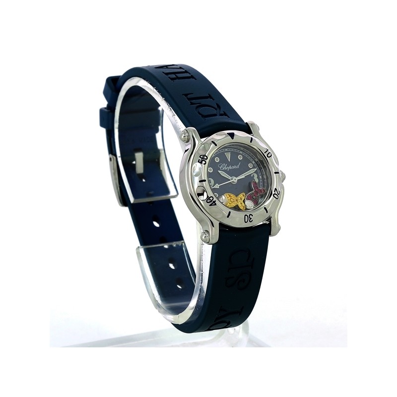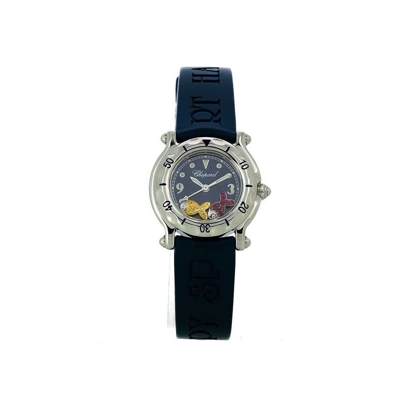 Ce modèle rare et recherché séduit par son cadran ludique et poétique, où de petits poissons colorés et diamants mobiles évoluent gracieusement entre deux glaces saphir, au gré des mouvements du poignet.