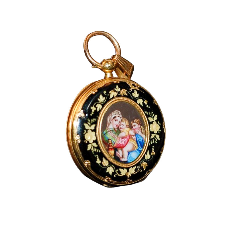Montre ancienne de col mécanique émaillée en or jaune 18 carats
